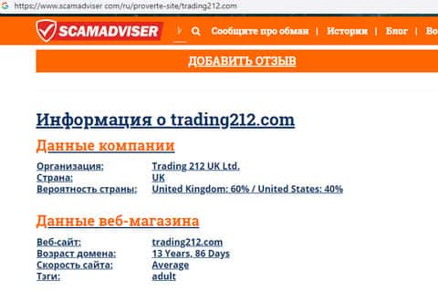 В связи с мошеннической и противозаконной деятельностью мошенников Trading 212 в течении последних лет их руководители предпочитают анонимность дабы избежать ответственности со стороны правоохранительных органов. Информацию о самом же сайте лохотрона Трейдинг 212 можно узнать с помощью портала scamadviser com, что вы можете увидеть ниже.