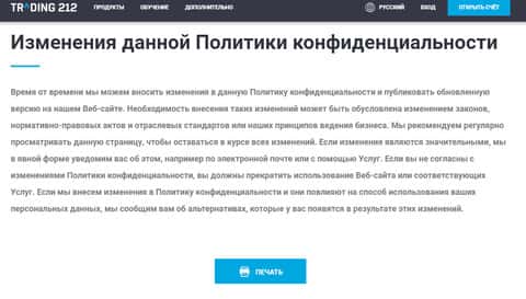 А завершается политика конфиденциальности у мошенников Трейдинг 212 довольно стандартно и ожидаемо, а именно условием от лохотрона Trading 212 о том, что они могут в любой момент изменять условия своей политики конфиденциальности. На изображении, расположенном ниже, вы можете увидеть и прочесть окончание политику аферистов Трейдинг 212.
