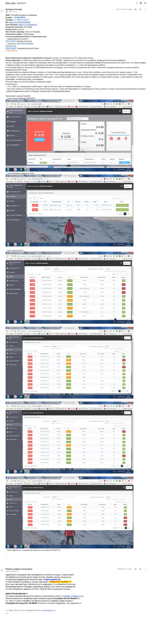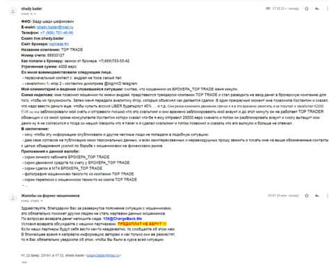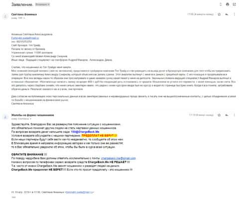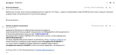 Теперь давайте конкретики больше приведем, берем дырявый лохотрон - ТОР Трейд, про который наши коллеги в чате говорят следующее: "вы понимаете, что эти отзывы пишут конкуренты". На что даны конкретные отзывы РЕАЛЬНЫХ клиентов, которые написали нам, это не где-то взятый отзыв, это прямые жалобы, публикуем их ниже. В жалобах указаны контакты пострадавших - свяжитесь сами с ними и узнайте все как есть из первых рук. Ниже приведем десяток жалоб, чтобы вопросов было меньше у всех.