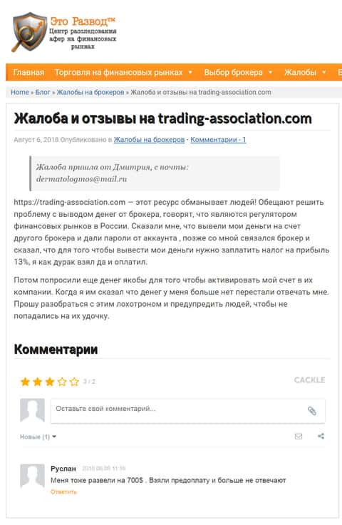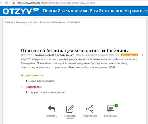 Отзывы Юа тоже имеют свою позицию по поводу мошенников Трейдинг Ассоциации.