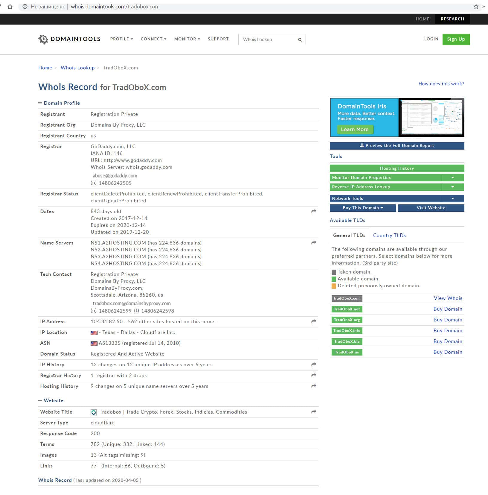 Далее Вы можете изучить более подробную инфу, указанную при регистрации домена компании ТрейдоБокс, которая размещена на сайте whois.domaintiils com. К сожалению в ней Вы не найдете ни названия юридического лица, ни личных данных о владельцах конторы, только данные регистрирующих организаций.