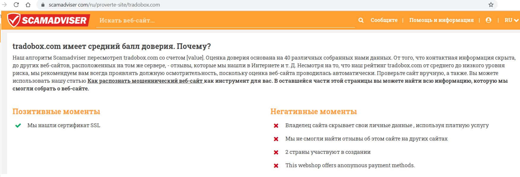 Ресурс scamadviser com оценил компанию TradoBox как потенциально опасную