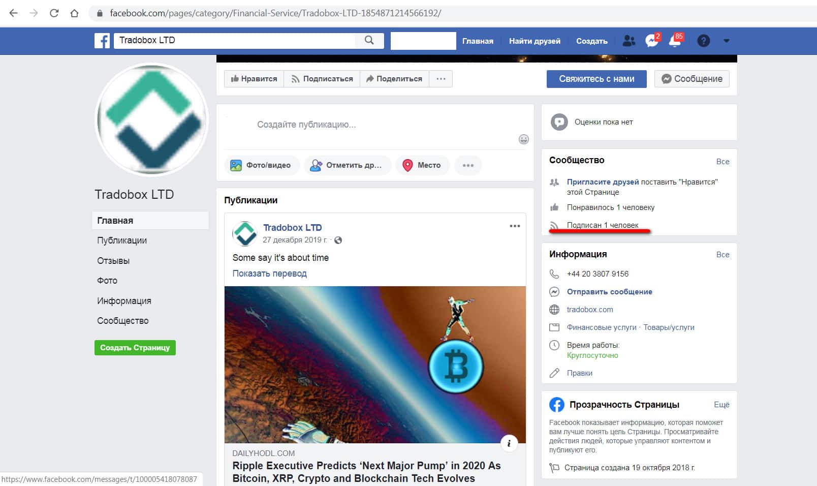 В сети интернет найдена страничка ТрейдоБокс в социальных сетях, а именно на FaceBook. Удивительный факт - компании уже почти три года, на Фейсбуке зарегистрирована в 2018 году, но подписчиком их странички является всего ОДИН человек. Контора явно не пользуется популярностью у пользователей.