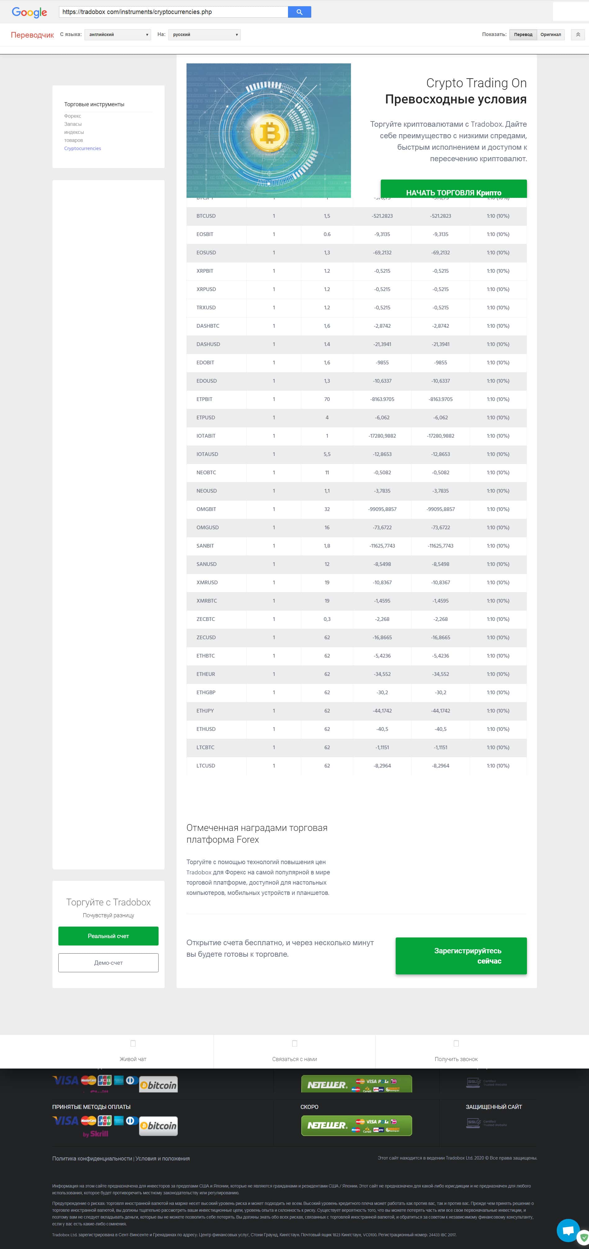 Официальный ресурс TradoBox в интернете оформлен только на английском языке, а по содержанию мало чем отличается от сайтов других скам-брокеров. С переведенной версией данного сайта можно ознакомиться ниже. На главной странице размещена инфа рекламного характера, завлекающая наивных людей.