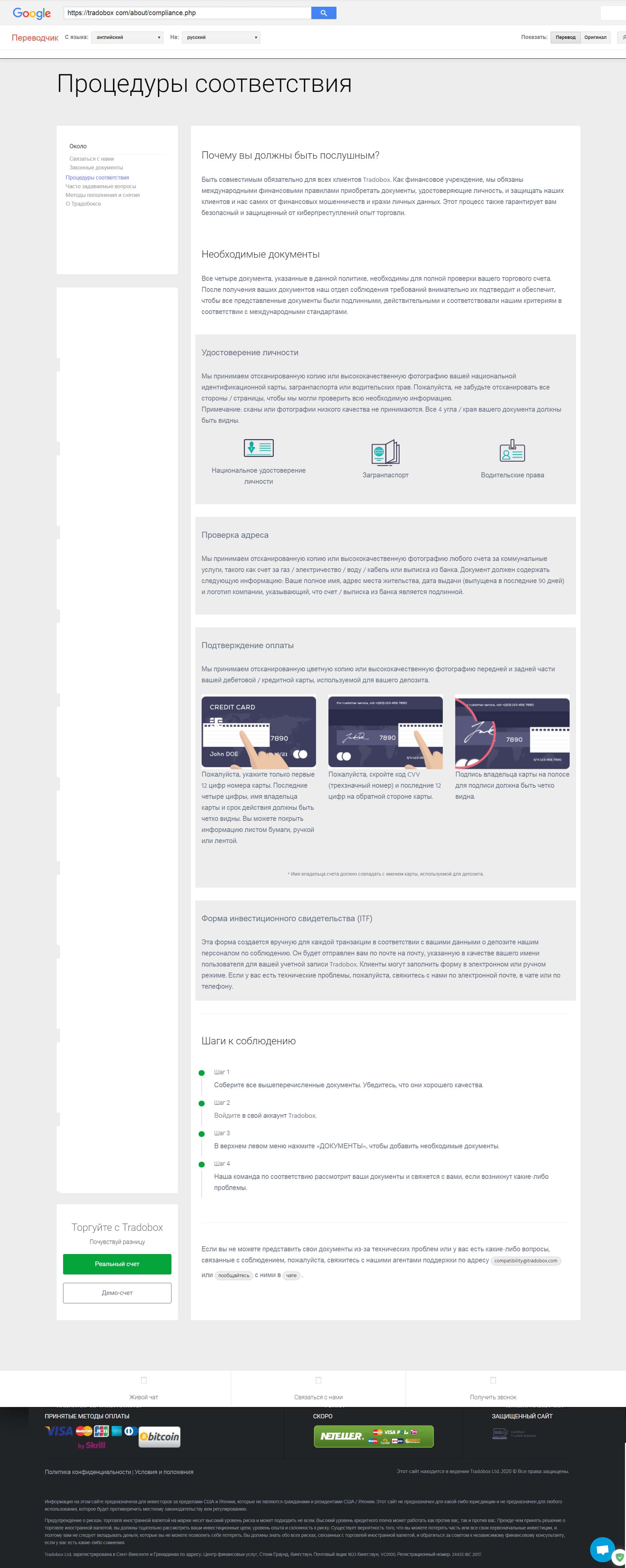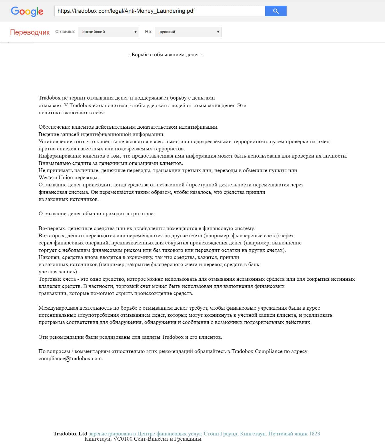 На сайте TradoBox Com отдельным документом идет файл, содержащий инфу про борьбу с отмыванием денег. Что вполне выполняется, но с учетом того, что вложенные деньги клиент обратно не получает. Запомните, то что передано мошенникам, у них и остается на счетах !!!