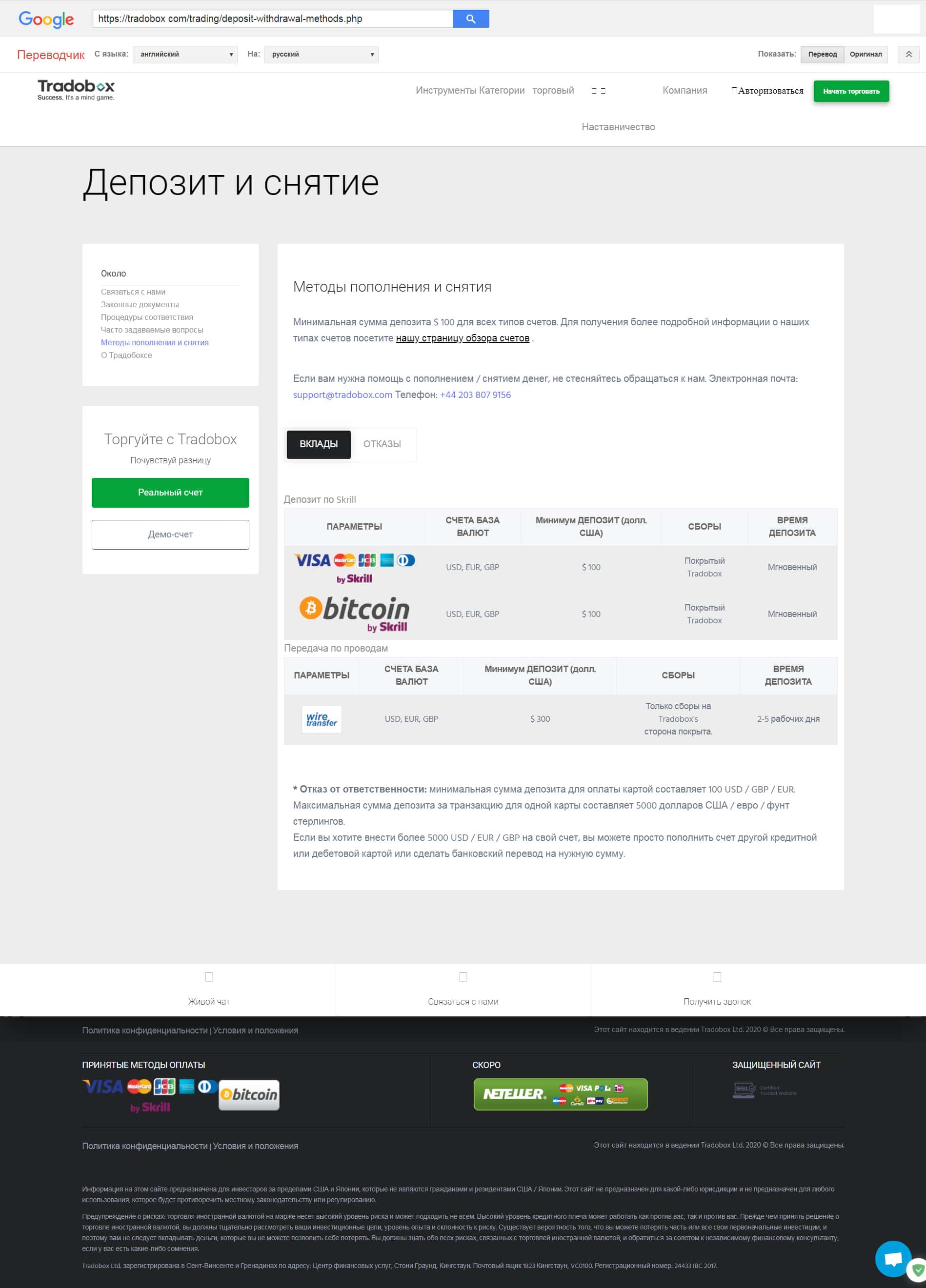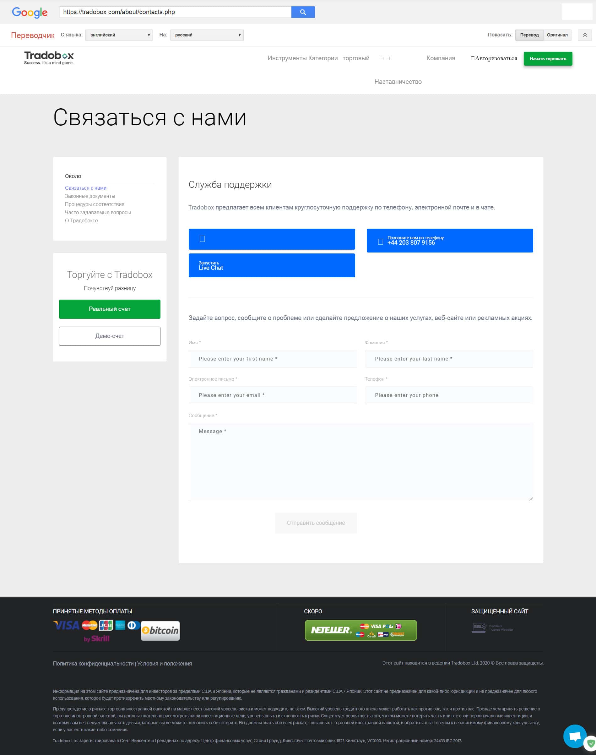 Контактная информация брокерской компании ТрейдоБокс