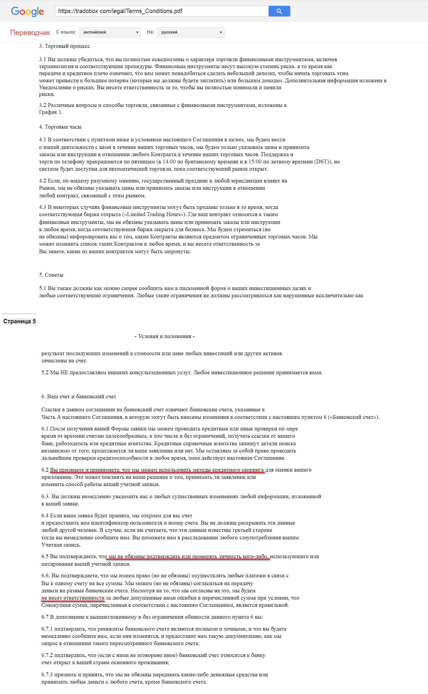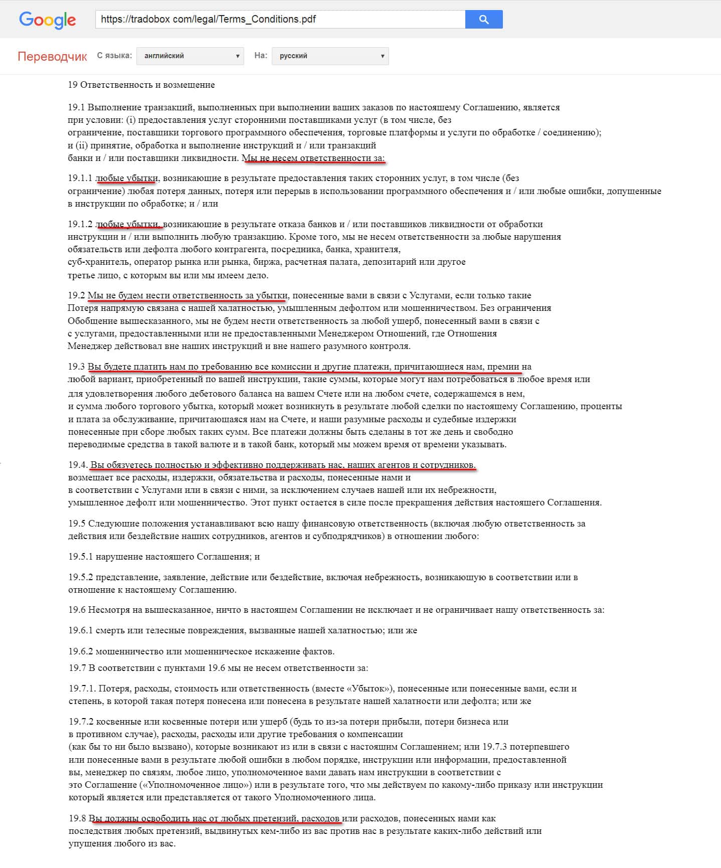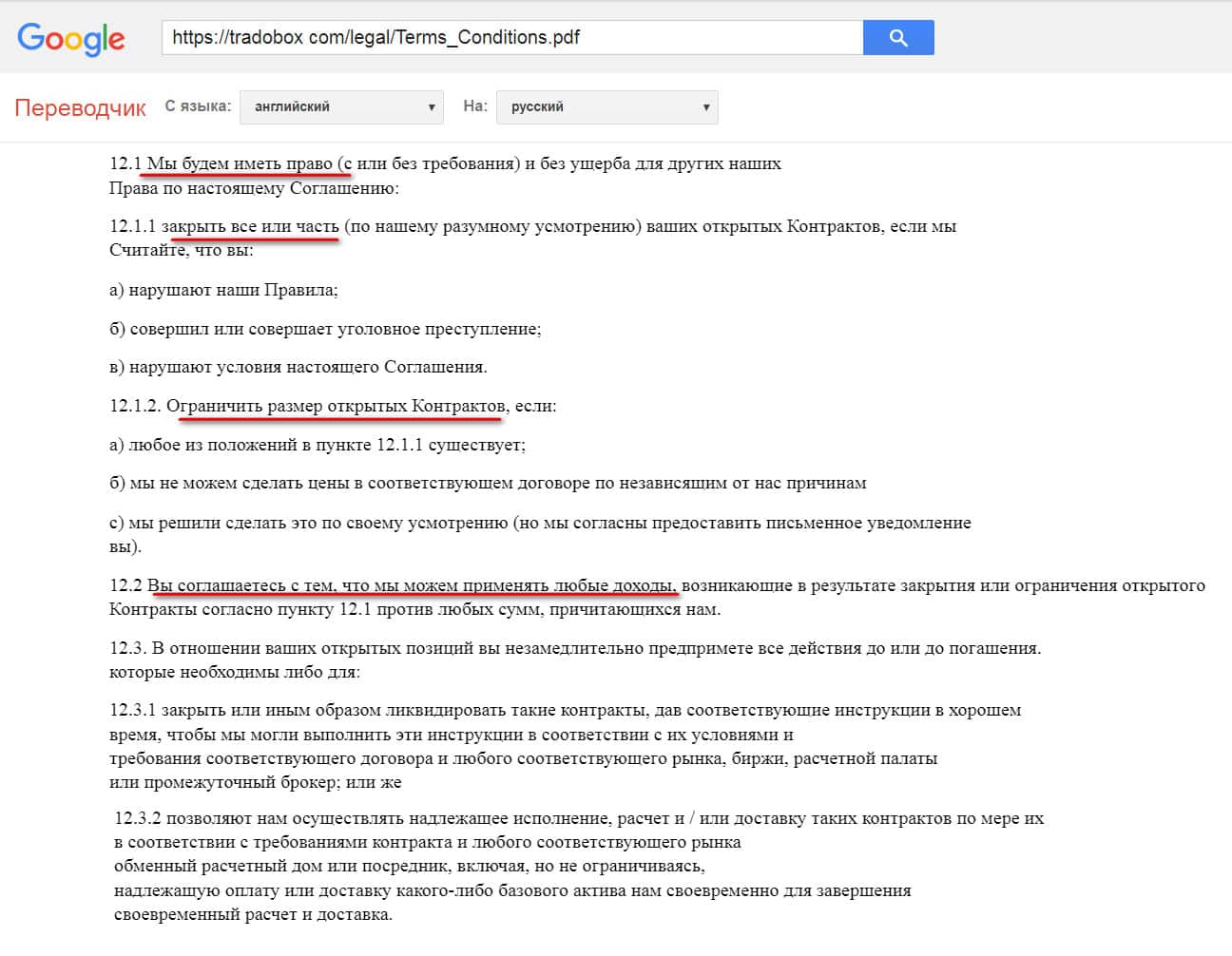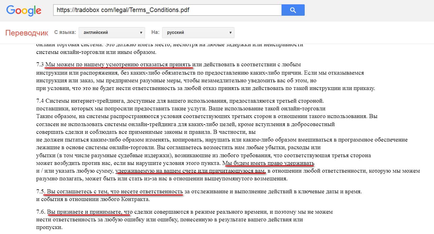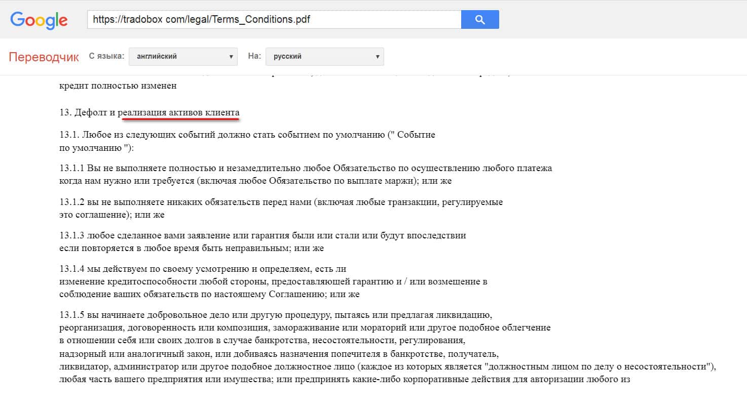 Следующее, на что хотим обратить ваше внимание - это на пункт в договоре, подтверждающий, что брокер может присвоить активы любого клиента. На практике подобное часто случается, а в совокупности с отсутствием каких-либо отзывов о ТрейдоБокс - это повод насторожиться.