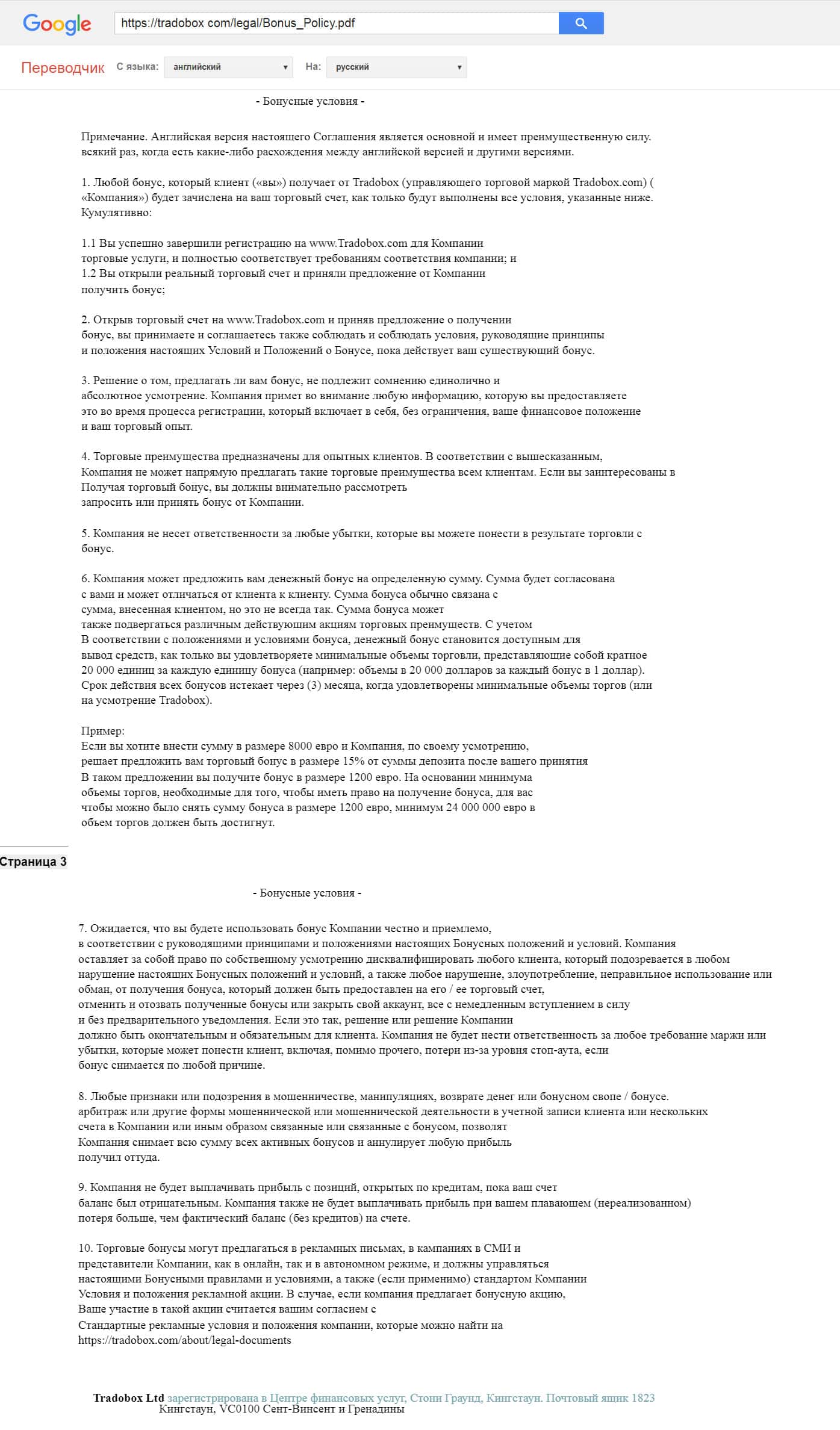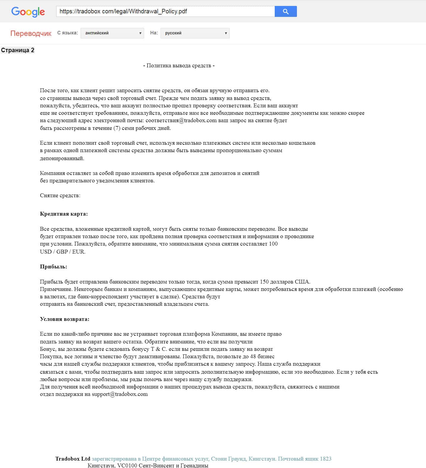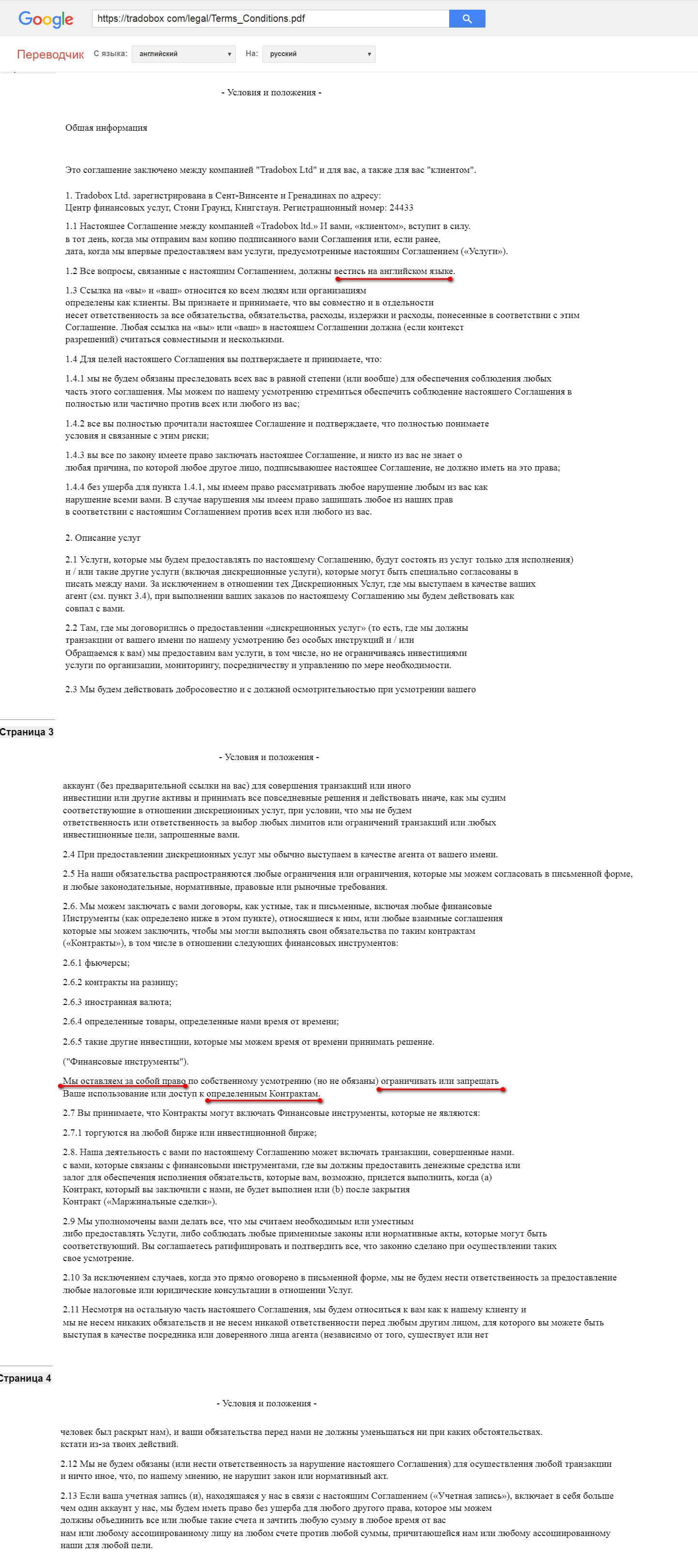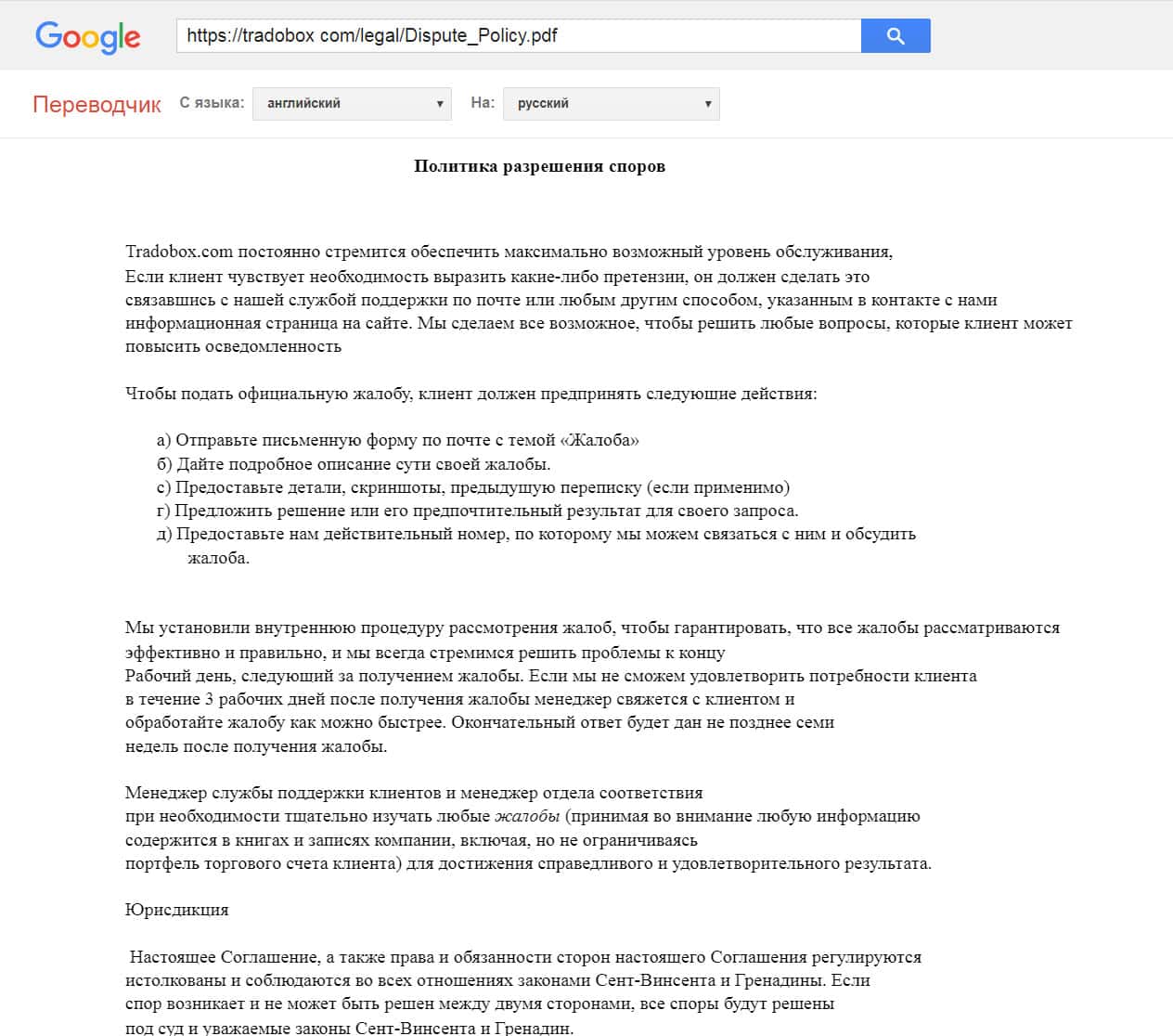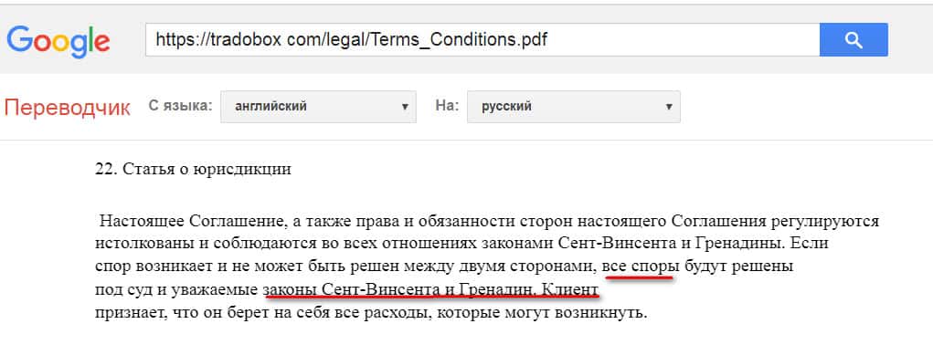 В заключительном разделе клиентского соглашения с компанией ТрейдоБокс объяснен порядок подачи и рассмотрения жалоб. Обращаем внимание, что в случаях когда потребуется подавать в суд, то делать это Вам придется на оффшорной территории Сент-Винсента и Гренадины.
