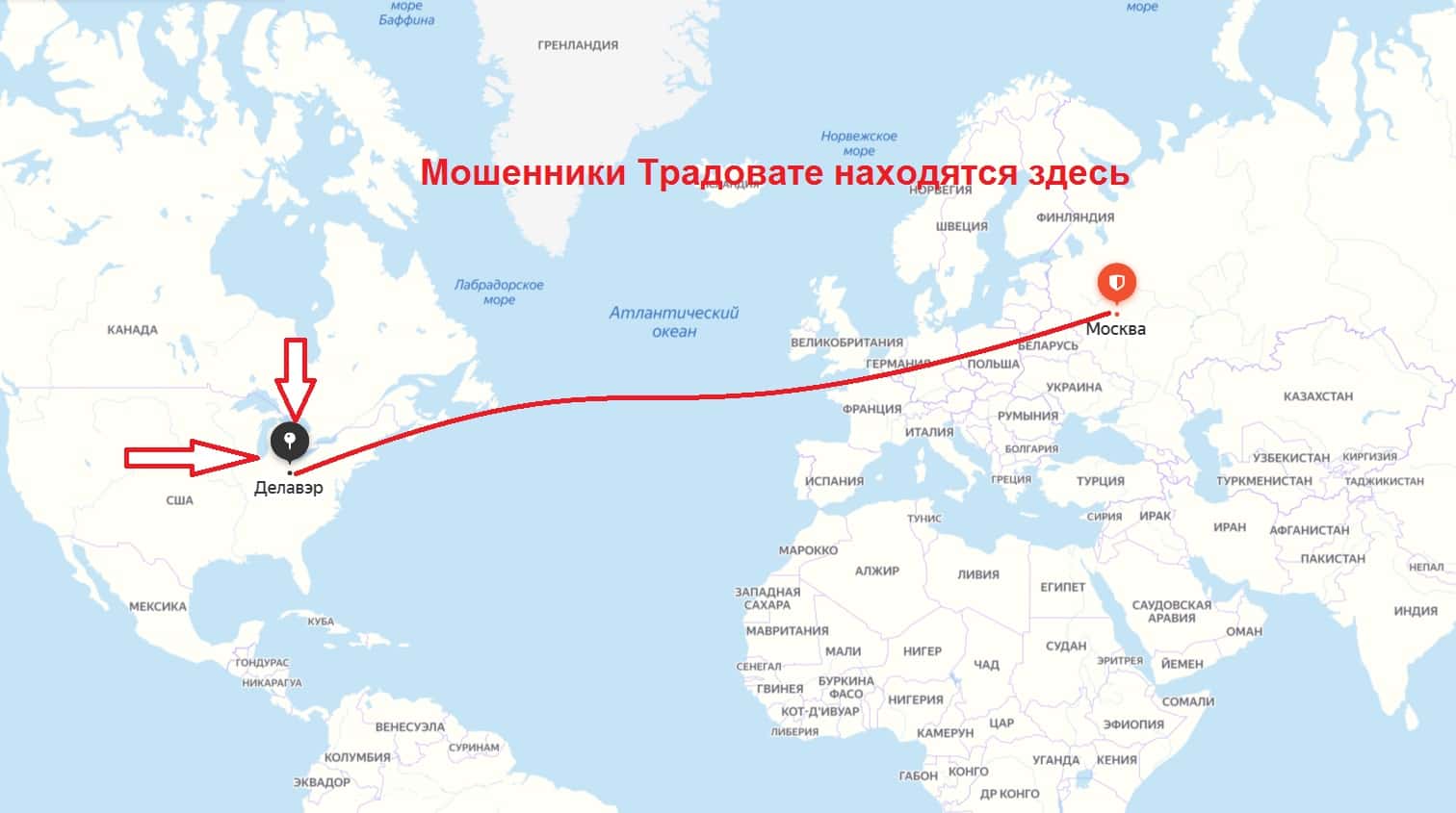 Сведения о месте регистрации Традовате - фейк, так как большинство проектов у себя на сайте указывают адрес местонахождения на территории США в качестве приманки.