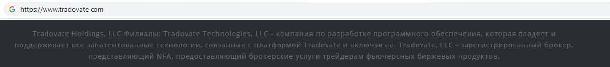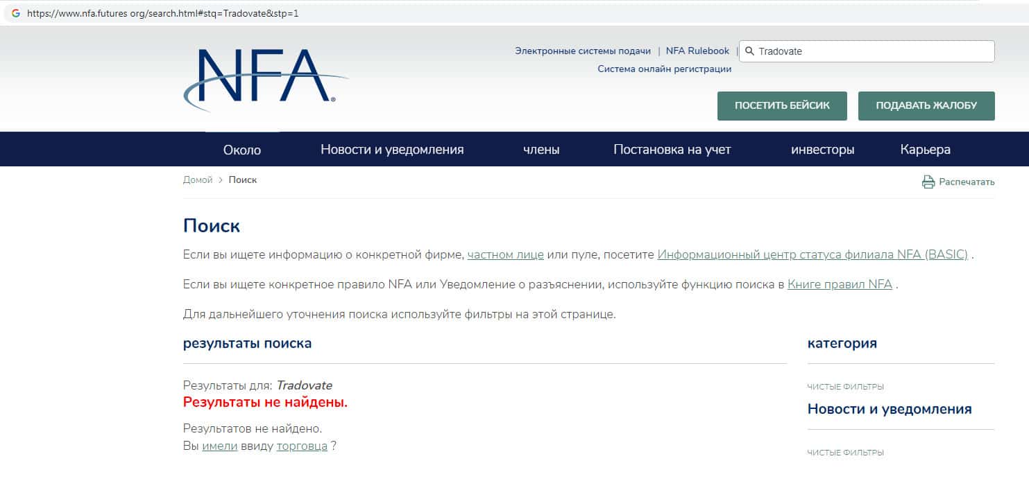 На сайте финансового регулятора nfa futures org нет никакой информации о скам-организации Tradovate, а так же о наличии лицензии.