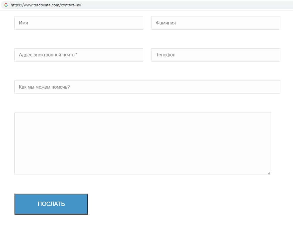 Аферисты Tradovate предлагают воспользоваться бланком обратной связи, при помощи которого ведут сбор данных о клиенте, фиксируя все данные на сайте.