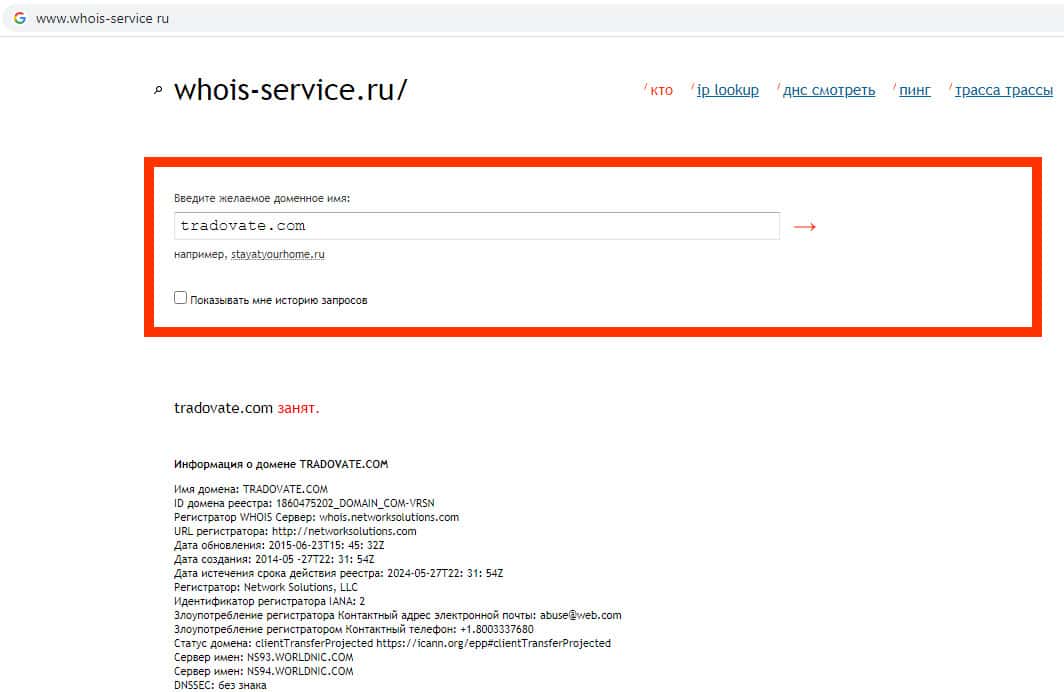Сервис whois-service ru не может найти данные о владельце домена сайта мошеннической организации Tradovate, доверять сайту нельзя.