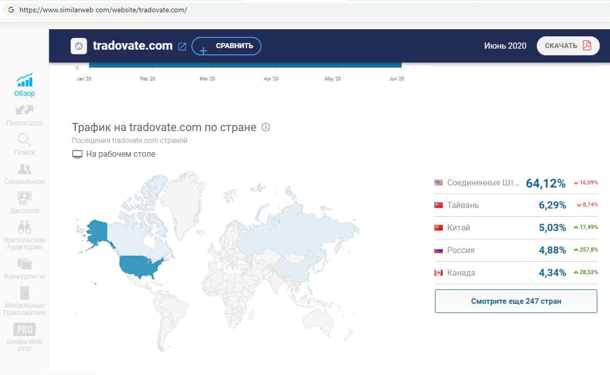 При проверке посещаемости интернет-сервиса псевдо-брокерской организации Tradovate на similarweb com оказалось, что среди трафика есть пользователи из России.