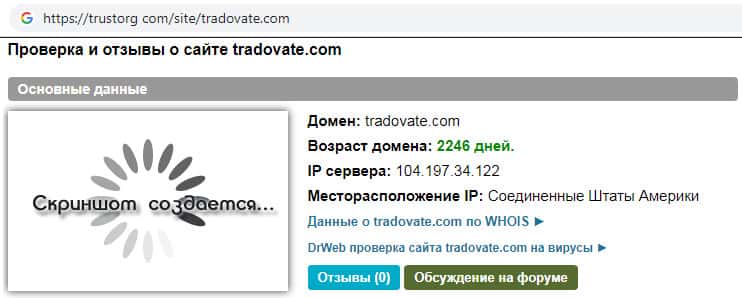Проверка онлайн-ресурса аферистов Традовате на trustorg com показала, что возраст домена к моменту написания статьи составляет 2246 дней, скорее всего домен купленный.