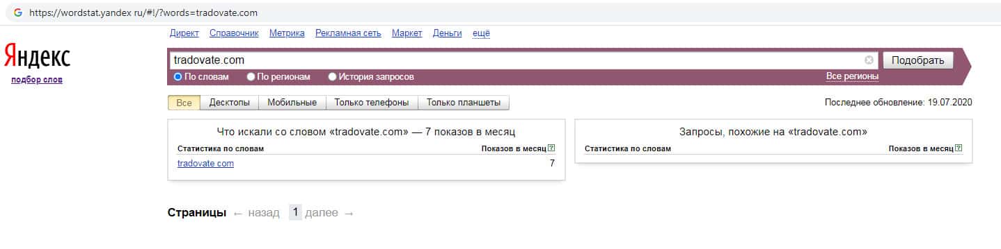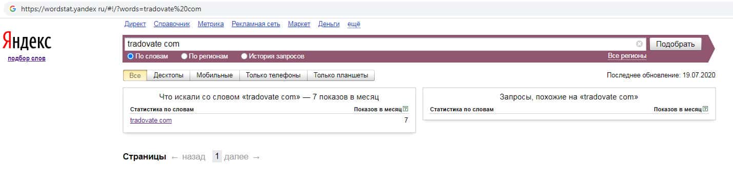 По запросам в поисковой системе Yandex, название бренда в виде домена сайта конторы с точкой "tradovate.com" количество запросов составило 7 показов за месяц.