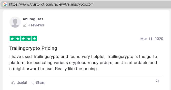 Портал обзоров и отзывов о интернет-ресурсах, посвященных торговым и инвестиционным площадкам trustpilot com располагает отзывом некоего Анурага Даса о торговой площадке Трайлинг Крипто. Этот отзыв является ярким примером проплаченных рекламных отзывов, служащих для привлечения наивных пользователей в сети мошенников.