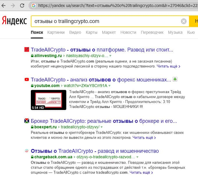 Не считая, приведенного выше, отзыва, в сети интернет невозможно найти какой-либо реальной информации о деятельности торговой площадки Трайлинг Крипто. И это с учетом её присутствия на рынке более двух лет. Это приводит к выводу о проводимой компанией постоянной зачистки пространства интернет от отзывов клиентов данного торгового ресурса.