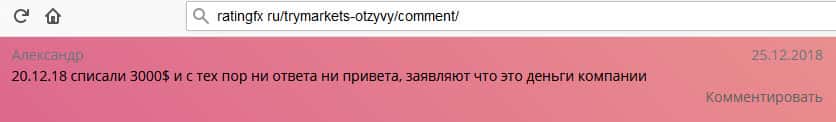 В том случае если кидалы из Трай Маркетс Вас развели, то в такой ситуации непременно напишите о данном факте нам. Сообщите свой е-майл в форме для обратной связи ниже, с Вами выйдут на контакт.