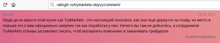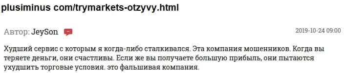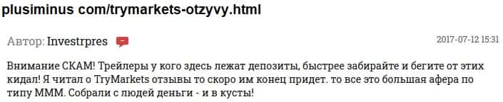 И это заявление об Трай Маркетс от их бывшего сотрудника! Он не стесняется прямо говорить, что их место - в тюрьме, потому что они кидают людей на деньги. А также, что сотрудников заставляют писать положительные отзывы, чтобы хоть как-то отмазать свои проделки, поэтому с этими лохотронщиками давно все понятно.