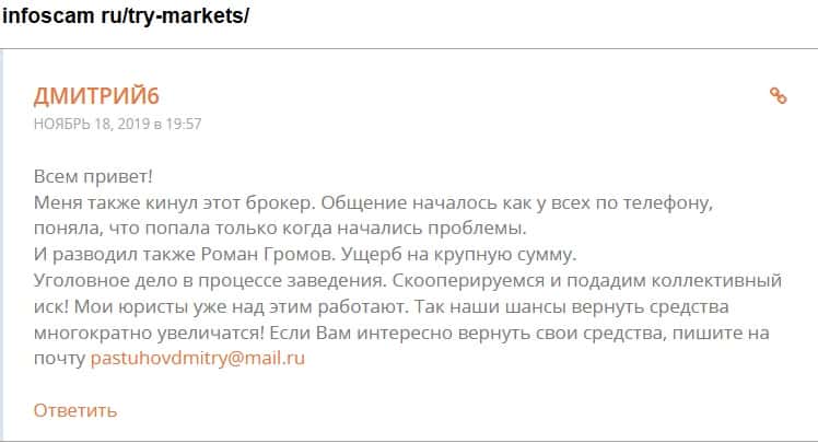 К сожалению, люди слишком поздно понимают, кто такие Try Markets. Уже потом начинают задумываться о том, чтобы подавать коллективный иск в суд и обращаться в полицию. Увы, но далеко не всегда удается вернуть деньги, потому что мошенники тоже в этом смысле страхуются.