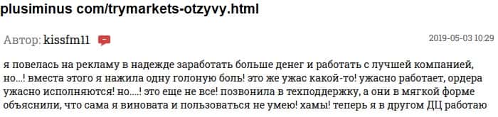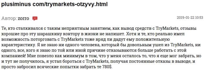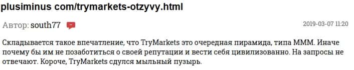 В своих издевательствах жулики Try Markets идут далеко - они по несколько месяцев мурыжат людей и не выводят им деньги на их счета. В данном случае мошенники просто "упали на мороз", как говорят в народе. Уже, понятно, что никто ничего отвечать не будет, с деньгами можно попрощаться.