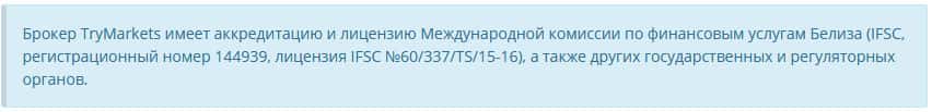 Деятельность Трай Маркетс по сути является незаконной, потому что они зарегистрированы в Белизе - офшорной зоне и не имеют по сути права вести свою деятельность на территории РФ и других стран СНГ. Такие регистрации нужны исключительно для того, чтобы не попасть под суд в будущем.