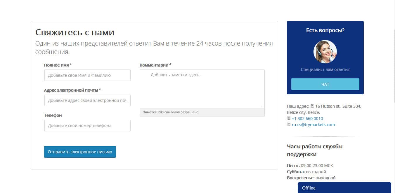 Связаться с жуликами Трай Маркетс можно следующими способами: