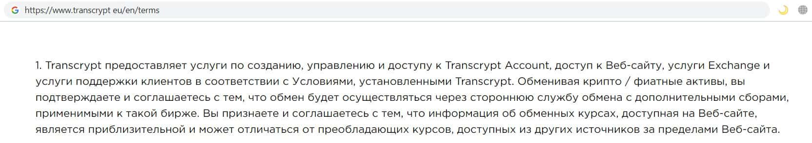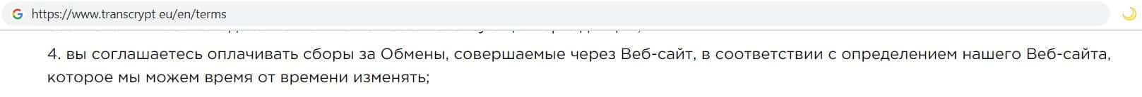В своём соглашении, компания финансовых кидал TransCrypt Eu указала, что обмен будет осуществляться через стороннюю службу с дополнительными сборами.