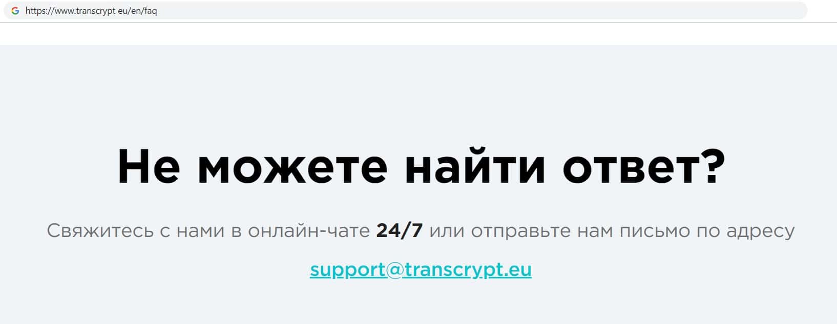 В качестве контактных данных, фирма кидал TransCrypt Eu указала лишь адрес электронной почты. Жулики не указали ни номер телефона ни адрес офиса. Почта мошенников: