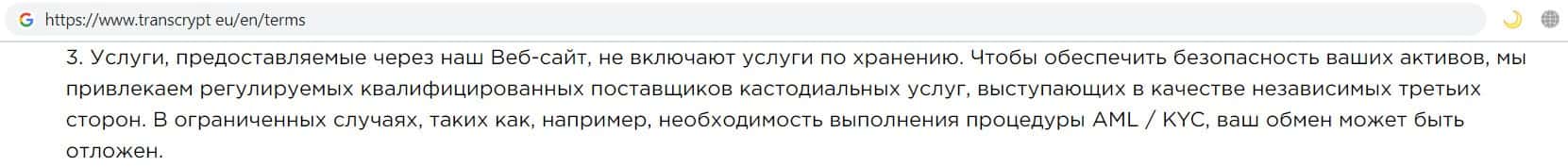 Контора аферистов TransCrypt Eu так же указала, что не предоставляет услуги по хранению денежных средств, данные услуги предоставляют сторонние поставщики кастодиальных услуг.