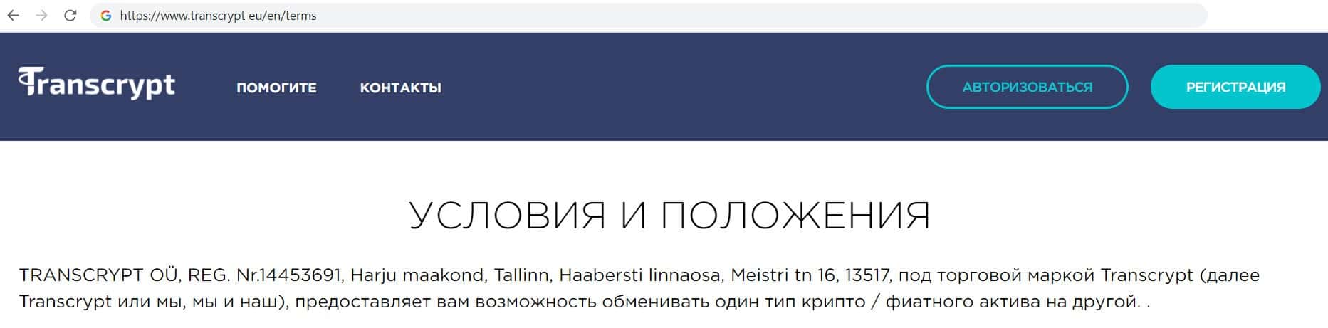 На своём главном интернет ресурсе компания жуликов Транс Крипт указала свою юридическое лицо, которым в свою очередь является компания TRANSCRYPT OÜ.