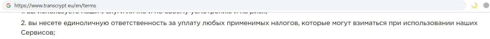 Недоконтора TransCrypt Eu так же указала, что все налоги и дополнительные сборы, которые могут возникнуть при использовании услуг компании, ложатся на плечи клиентов.
