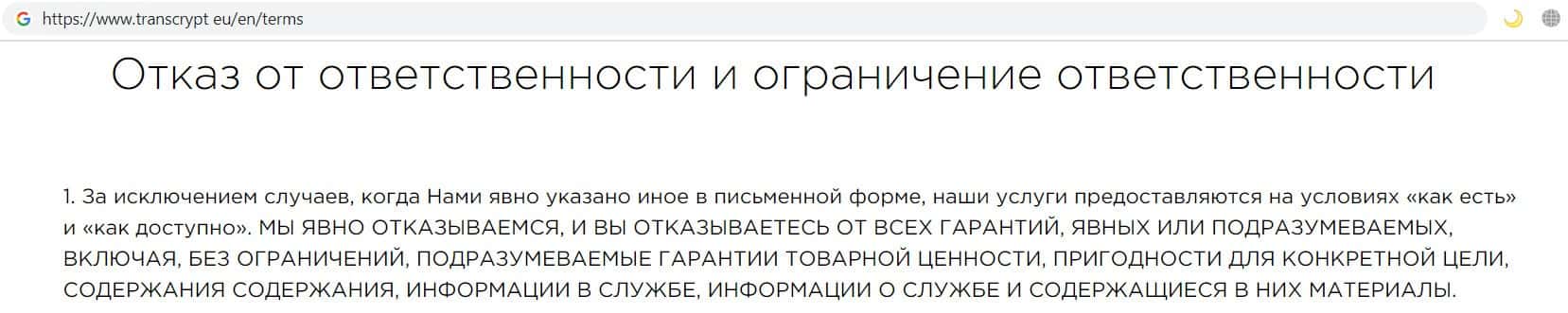 В этом пункте контора финансовых жуликов Транс Крипт отказалась от ответственности за точность всей информации на своём сайте, а так же от гарантий товарной ценности.