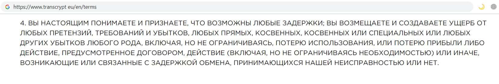 Фирма жуликов TransCrypt Eu так же заставляет клиентов отказаться от каких либо претензий в сторону компании, которые так же связанны с потерей денежных средств.