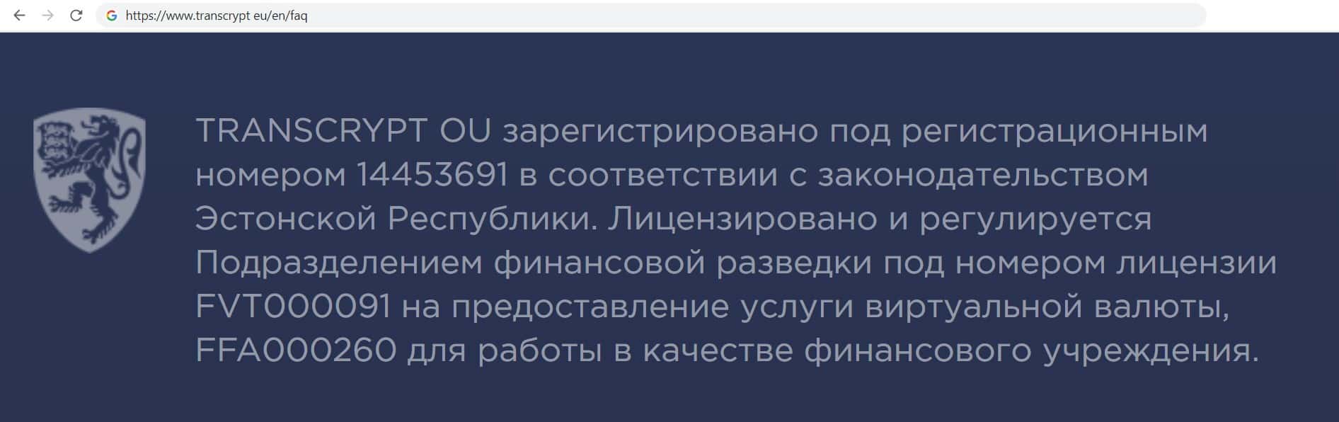 Фирма аферистов TransCrypt Eu указала Эстонию местом своей регистрации, но доверять этой информации не стоит, так как мошенники часто публикуют фальшивую информацию.