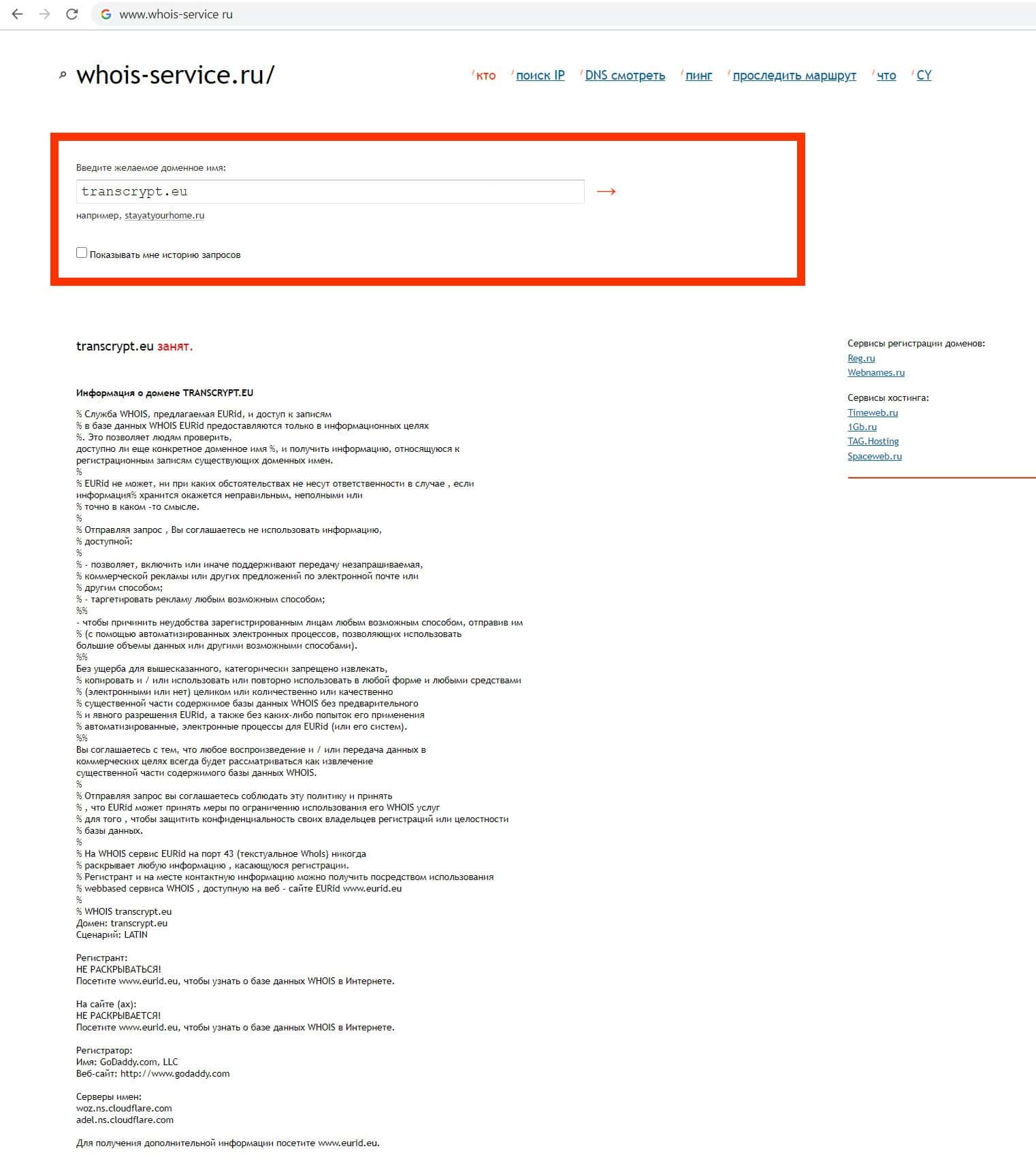 Мы использовали сайт whois-service ru чтобы узнать кто владеет доменом фирмы TransCrypt Eu. но оказалось, что мошенники скрывают владельца своего домена.