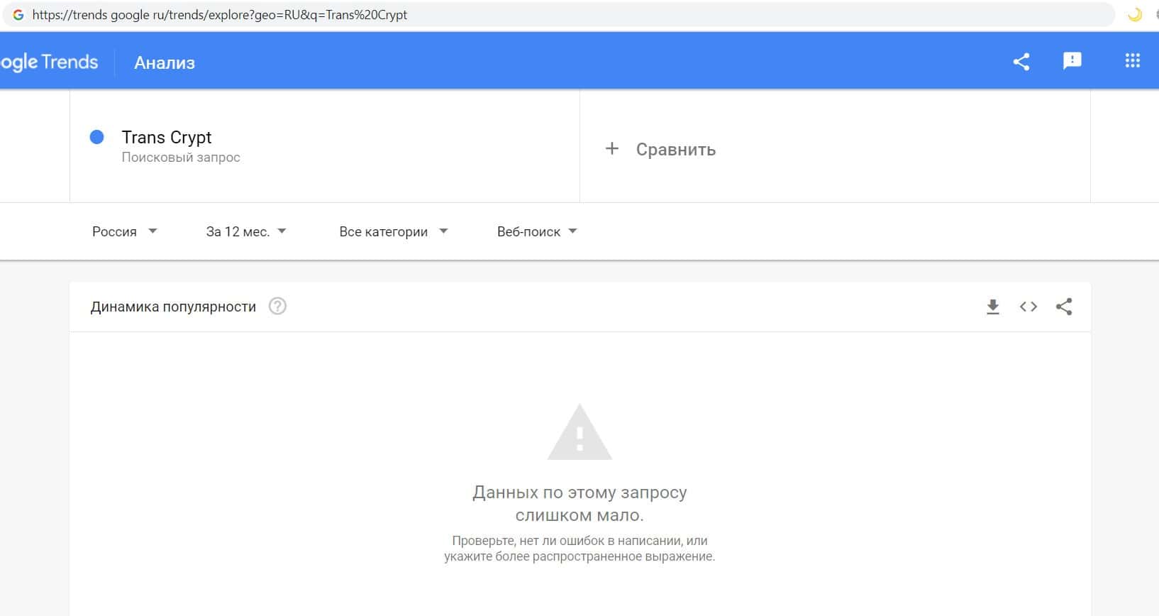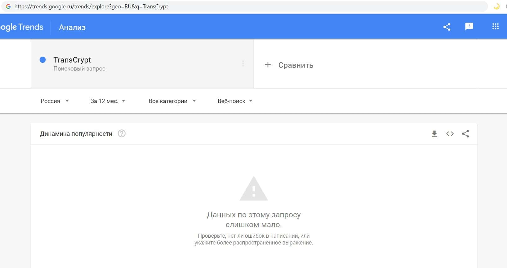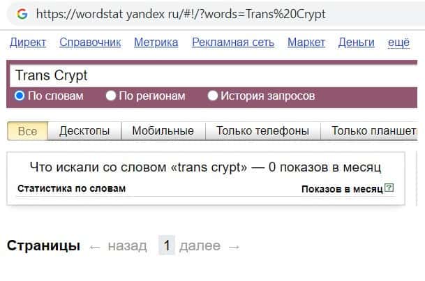 Далее мы проверили количество запросов конторы аферистов TransCrypt Eu по названию фирмы, но с пробелом, а именно "Trans Crypt". Но и этот запрос пользователи не совершали.