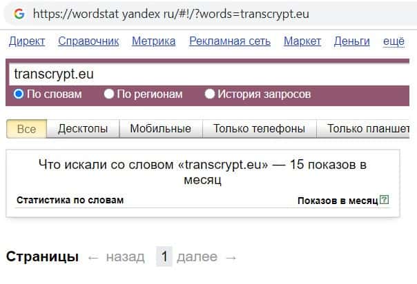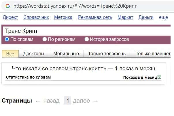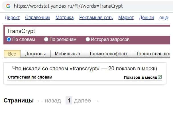Проверили мы и количество запросов компании TransCrypt Eu по русскоязычному названию фирмы, а именно "Транс Крипт". Всего 1 раз пользователи совершили данный запрос.