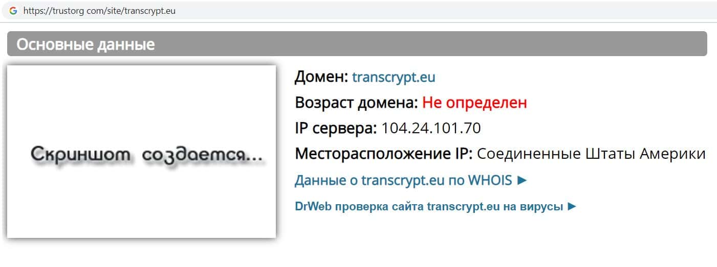 С помощью сайта "Доверие в Сети" мы решили узнать возраст сайта кидал Транс Крипт, но оказалось, что компания скрывает свой возраст, что является очень подозрительно.