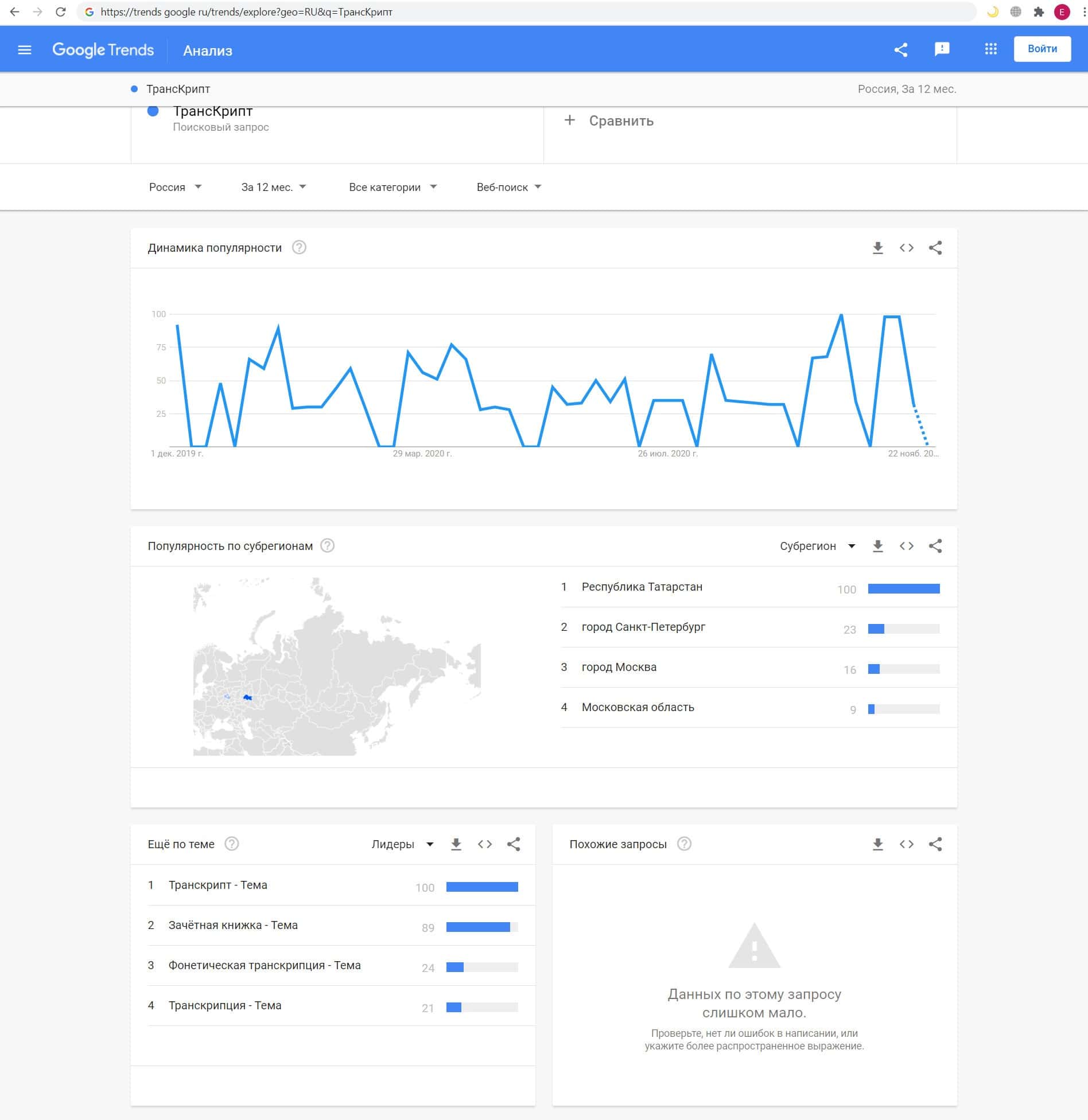 Далее мы проверили количество запросов Транс Крипт по русскоязычному названию, но без пробела, а именно "ТрансКрипт". 11186 раз пользователи выполнили этот запрос.