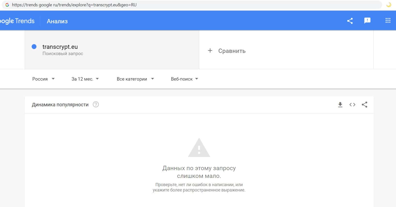 Ещё мы проверили количество запросов недоконторы TransCrypt Eu по русскоязычному названию фирмы, а именно "Транс Крипт". Но целый год никто не выполнял данный запрос.