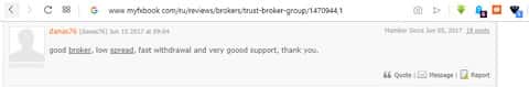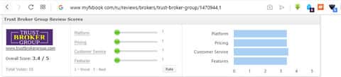 На портале myfxbook находится страница, которая сделана для того, чтобы люди могли оставить отзыв и дать общую оценку работе с сервисом-лохотроном ТрастБрокер. На данном сайте находится всего лишь два отзыва, которые нельзя назвать правдивыми только из-за их насыщенности эпитетов, о том какая ТрастБрокер идеальная брокерская компания, любящая своих наивных клиентов.