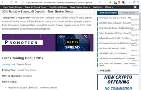 На портале allforexbonus неизвестный автор-аноним выложил статью, в которой рассказывается о всех тонкостях работы на кухне TrustBroker. Во время написания статьи, действовала акция при открытии брокерского счета: "Presents 50% Tradable Forex Deposit-Bonus for every deposit made into the live account". Я могу сказать только одно. Ни один реальный брокер не будет дарить вам деньги просто так.