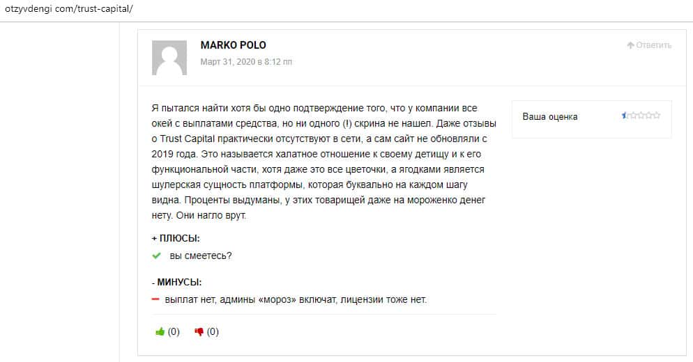 В данном отзыве пользователь сети описывает, что он хотел бы найти хоть одно подтверждение тому, что у компании Trust Capital Group все в порядке. Дело в том, что нет ни одного отзыва, где человек бы смог предоставить скриншот с выводом средств. Так что это лишь муляж, которым пользуется лохотрон для привлечения клиентов.