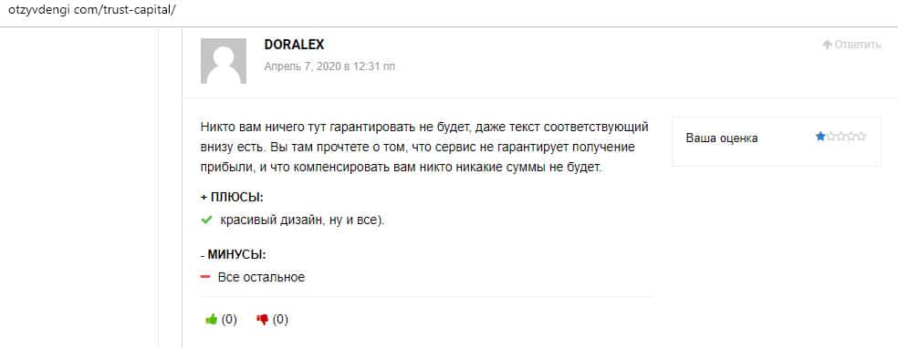 Мошенники Trust Capital Group смогли сделать только красивый дизайн сайта, пусть даже малоинформативный. И все же стоит отметить, что аферисты во всем остальном просто в минусовом значении. Ни регуляции, ни условий, ни выплат - о чем тут еще можно говорить, когда дело идет о гарантии прибыли с их стороны.