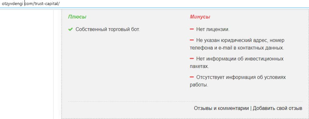 Из текста обзора о мошеннической конторе Trust Capital Group, можно сделать вывод, что они имеют больше минусов, чем плюсов. Там указано, что аферисты не имеют лицензии, на сайте нет юридического адреса и контактных данных, нет никаких данных об инвестиционных пакетов, а также не раскрыты условия сотрудничества.