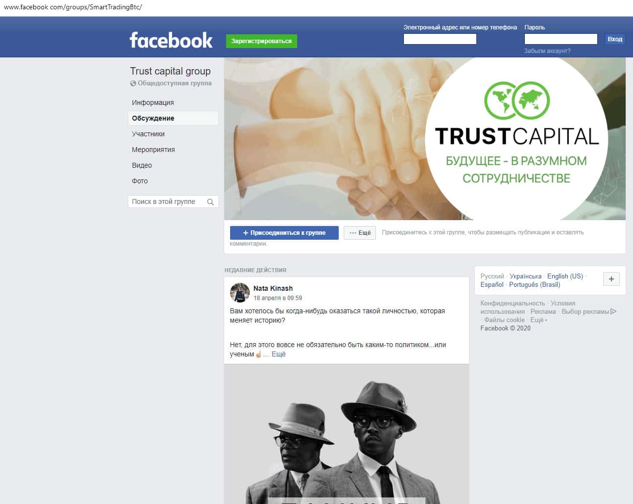 Группе в Фейсбук шарлатанской организации Траст Капитал Групп также нечем похвастаться, потому что у них подписчиков нет вообще. Они ведут скрытную деятельность, так как напрямую связываются с потенциальными жертвами через личные сообщения и разводят их. Вот собственно ссылка на группу facebook com/groups/SmartTradingBtc