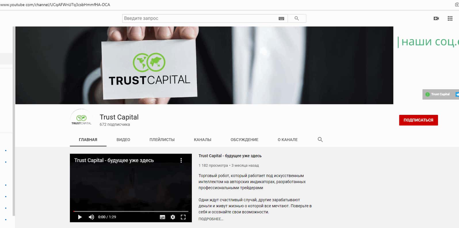 Мошенническая организация Trust Capital Group создала для себя несколько групп и каналов в социальных сетях, дабы как можно больше привлечь лохов в свой проект. В данном случае просматривается канал в Ютуб, где они могли собрать всего-то 672 подписчика. Вот ссылка на канал youtube com/channel/UCqAFWnU7q3csbHmmfHA-DCA