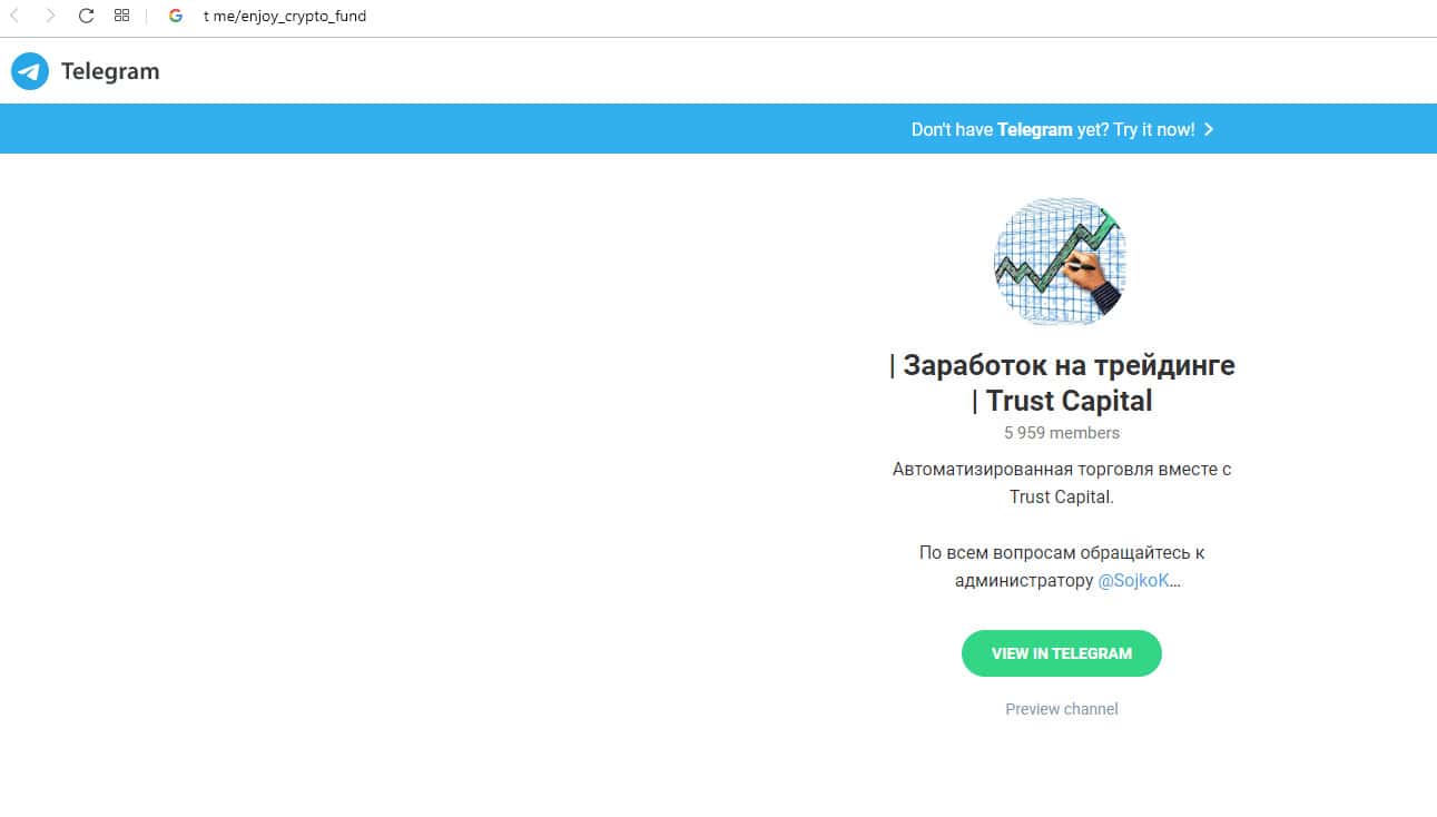 Ну и конечно же самый раздутый способ Привлечения лохов в шарлатанскую организацию Trust Capital Group, это канал в Телеграм. Они нагнали туда множество ботов и это большая половина от почти 6 000 членов. Таким образом люди просто по незнанию могут попасться туда и лишиться всех денег. Ссылка на Телеграм-канал t me/enjoy_crypto_fund