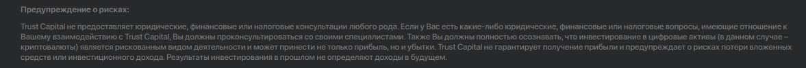 Если рассматривать регуляцию деятельности мошеннической конторы Trust Capital Group, то стоит отметить, что ее попросту нет. Потому что такой кухне-однодневке разрешение на обворовывание клиентов не отдадут. Мошеннички прикрываются предупреждением о рисках, что якобы сами виноваты, если все деньги потеряются.